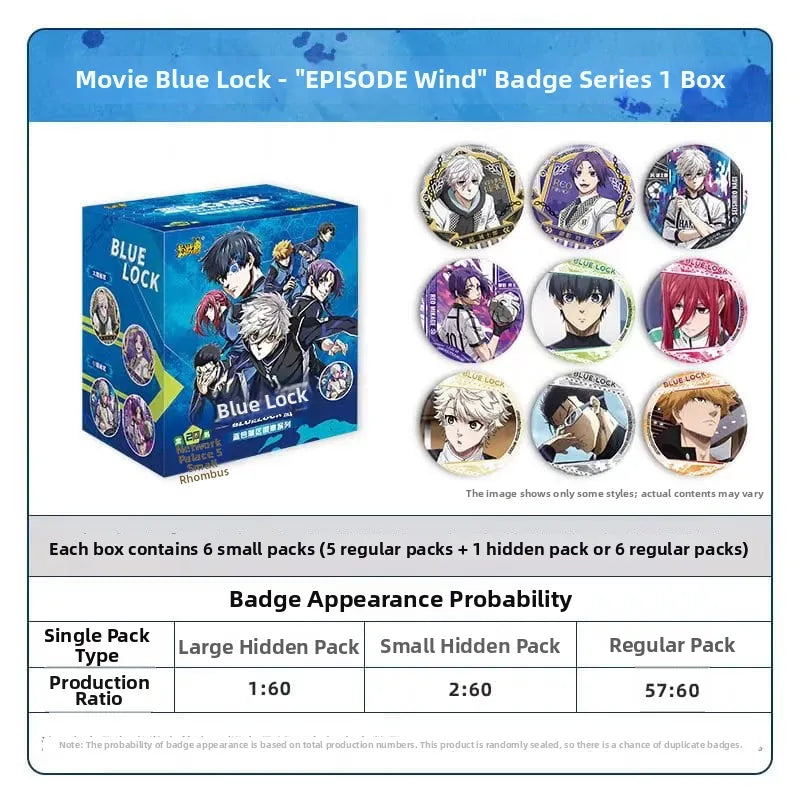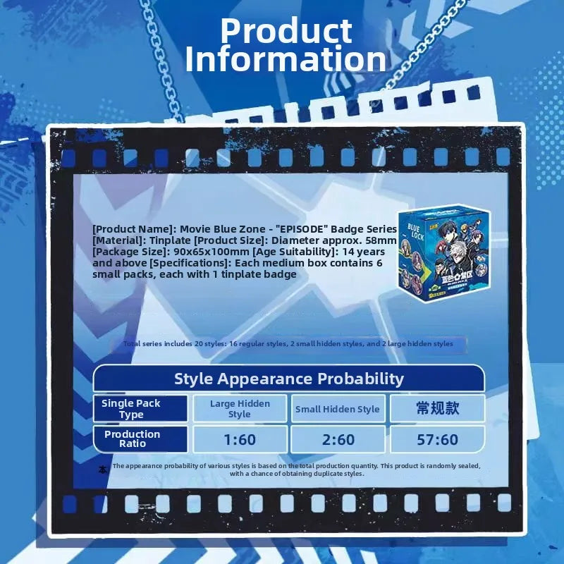 This tinplate product has a diameter of approx. 58 mm and packaging dimensions of 90 × 65 × 100 mm, with specifications of 1 tinplate badge per small pack and 6 small packs per medium box; the full collection includes 20 variants, consisting of 16 regular variants, 2 minor secret variants and 2 major secret variants.
