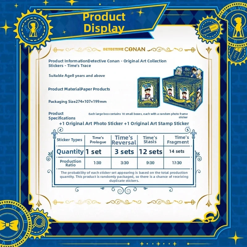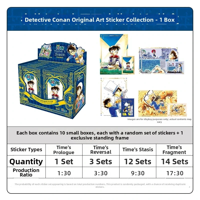 Each box contains 10 small boxes, each with a random set of stickers + 1 exclusive standing frame