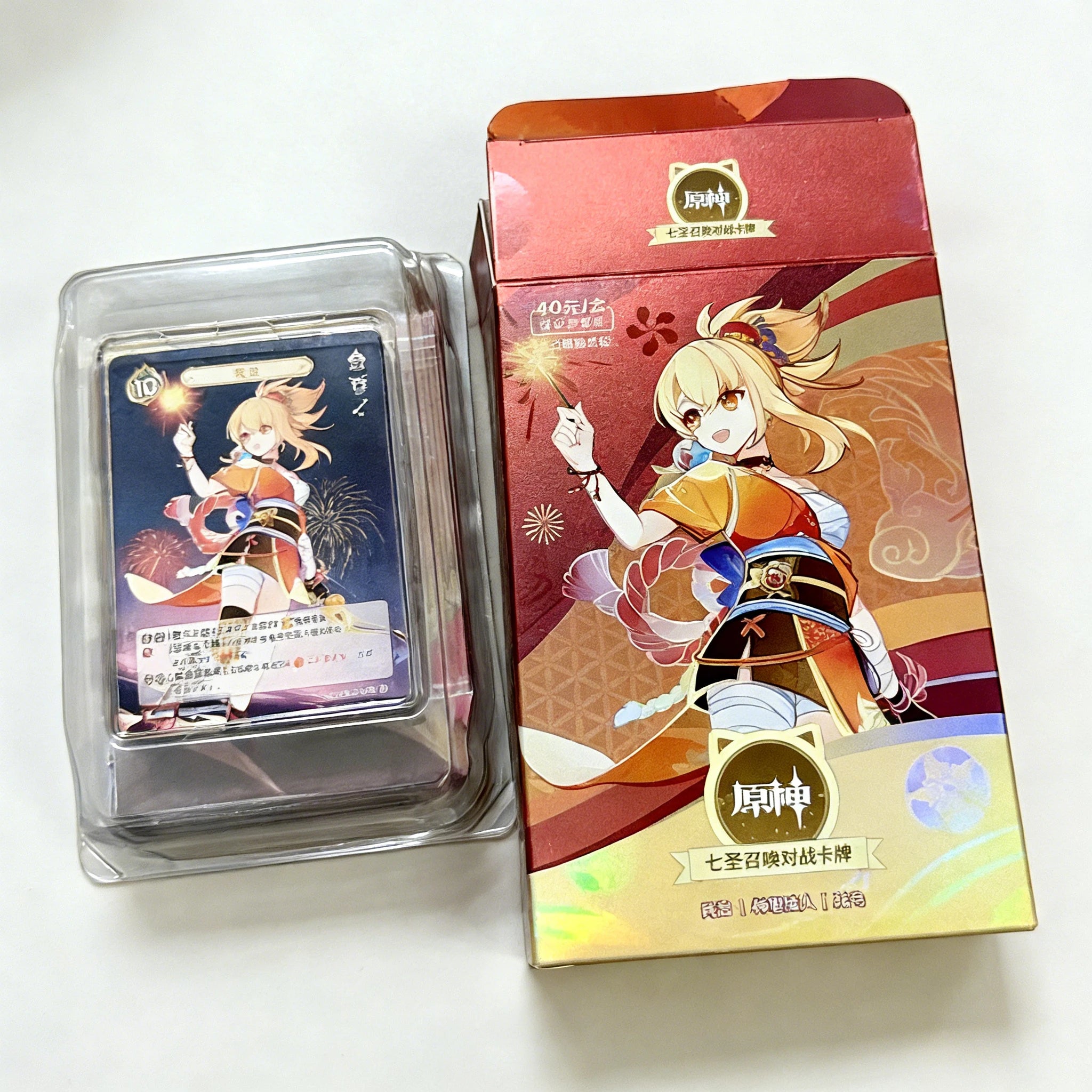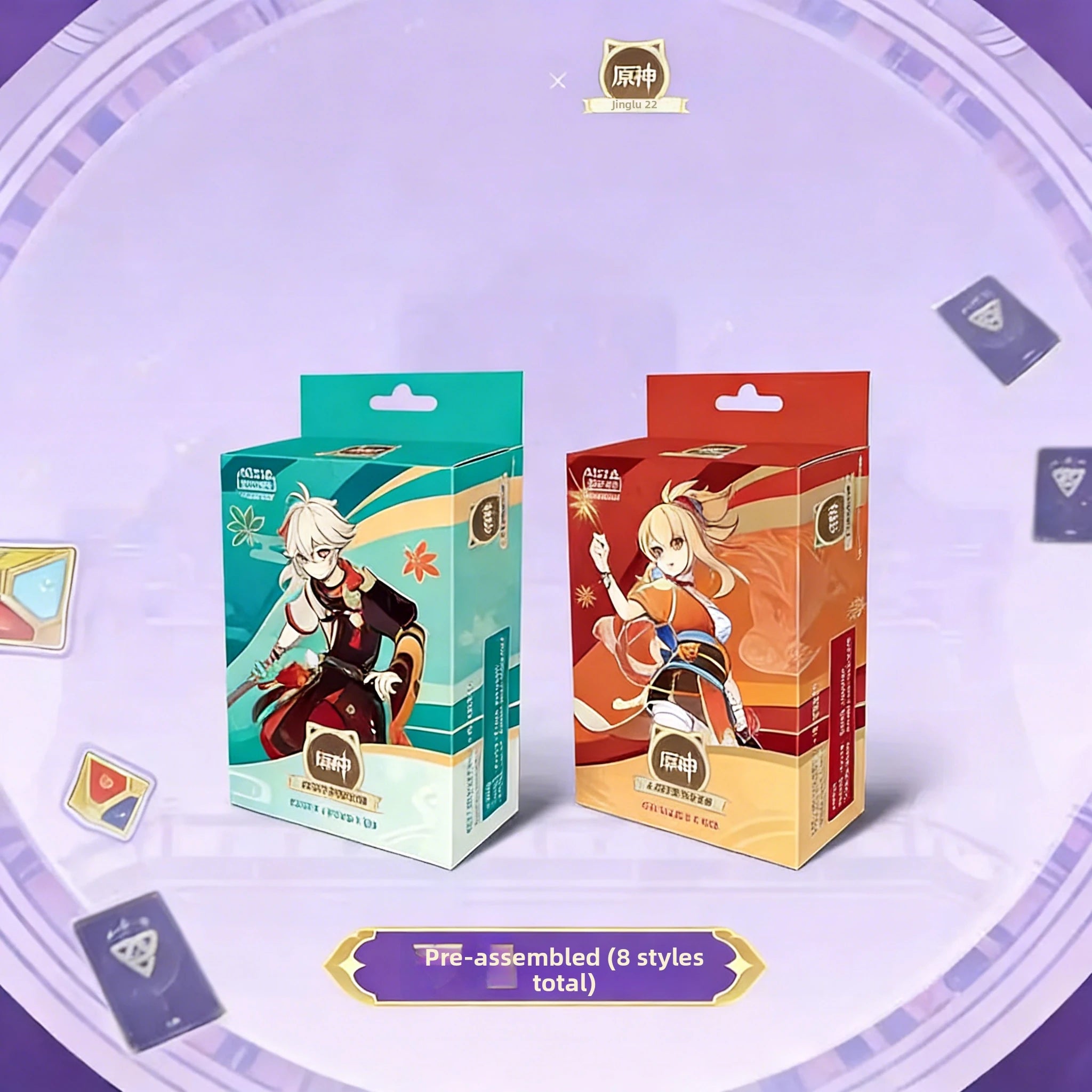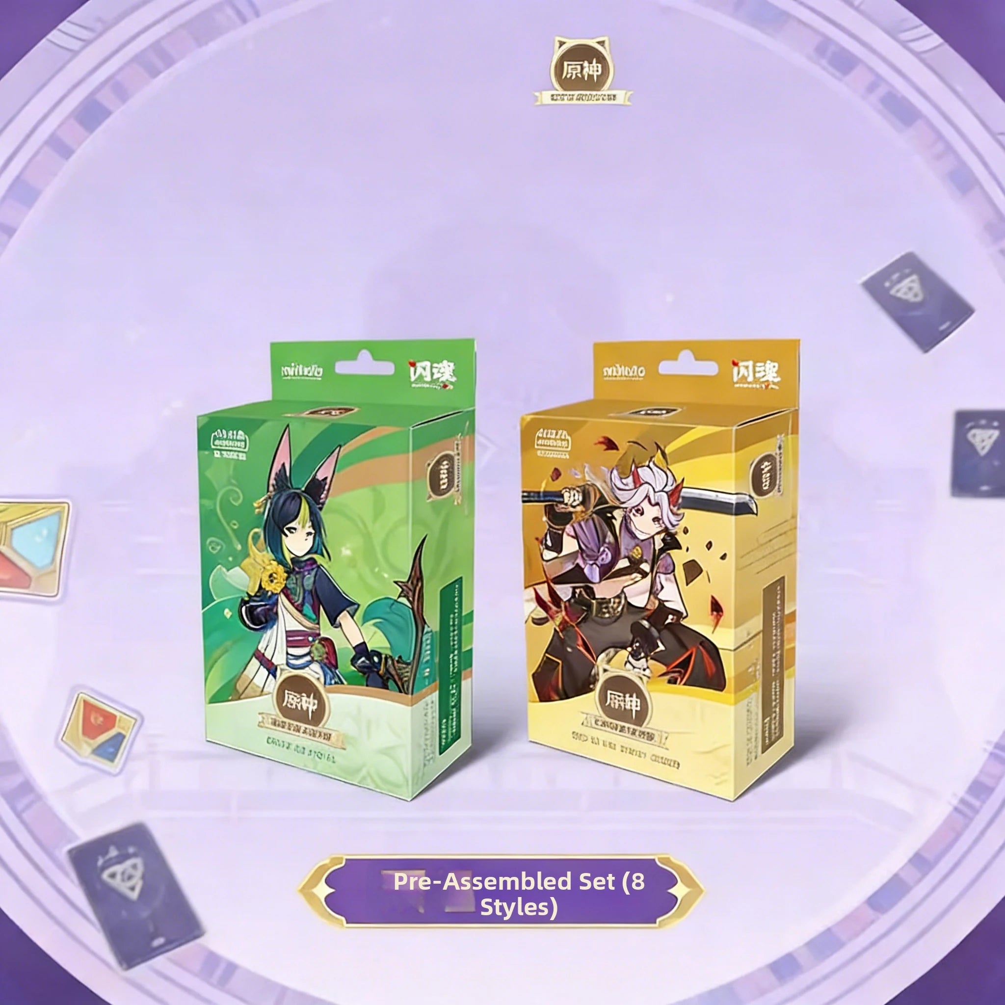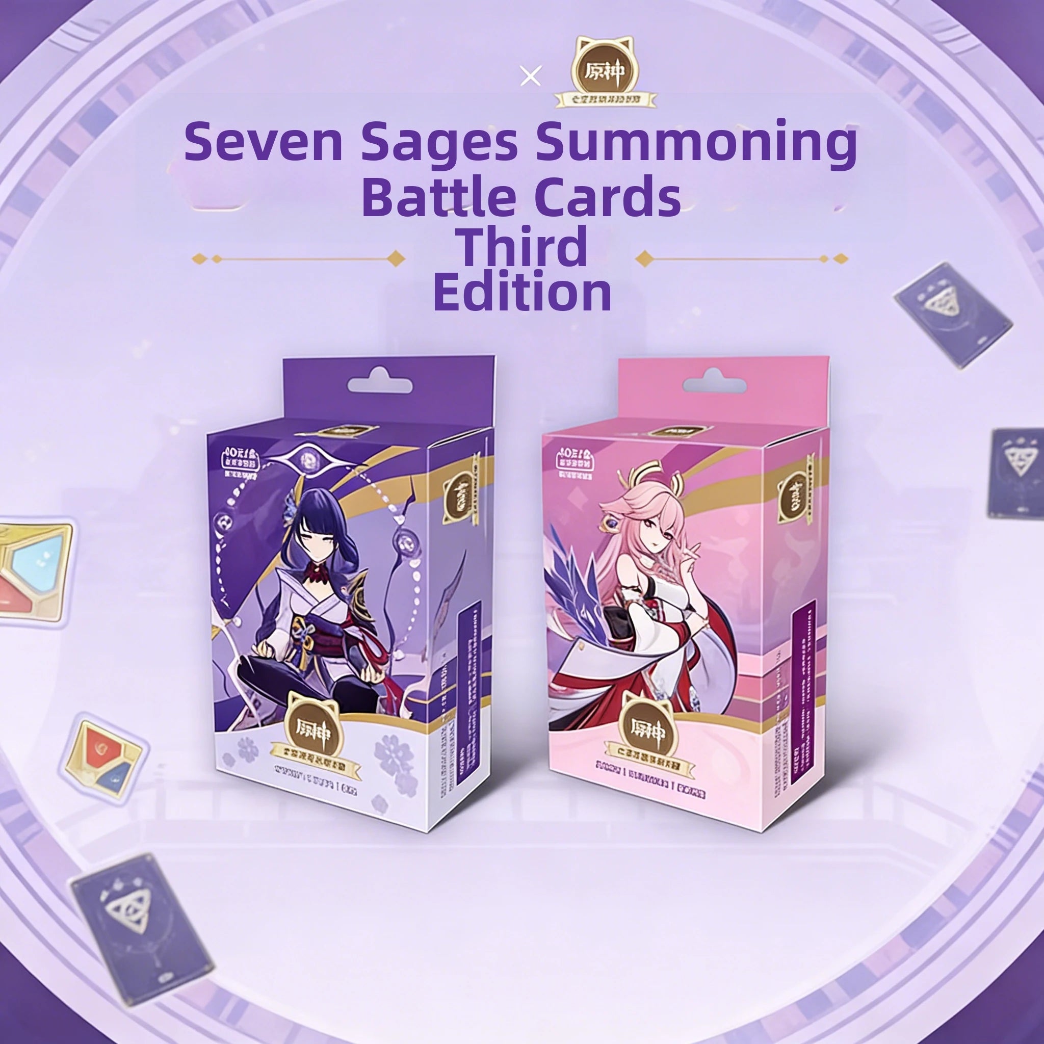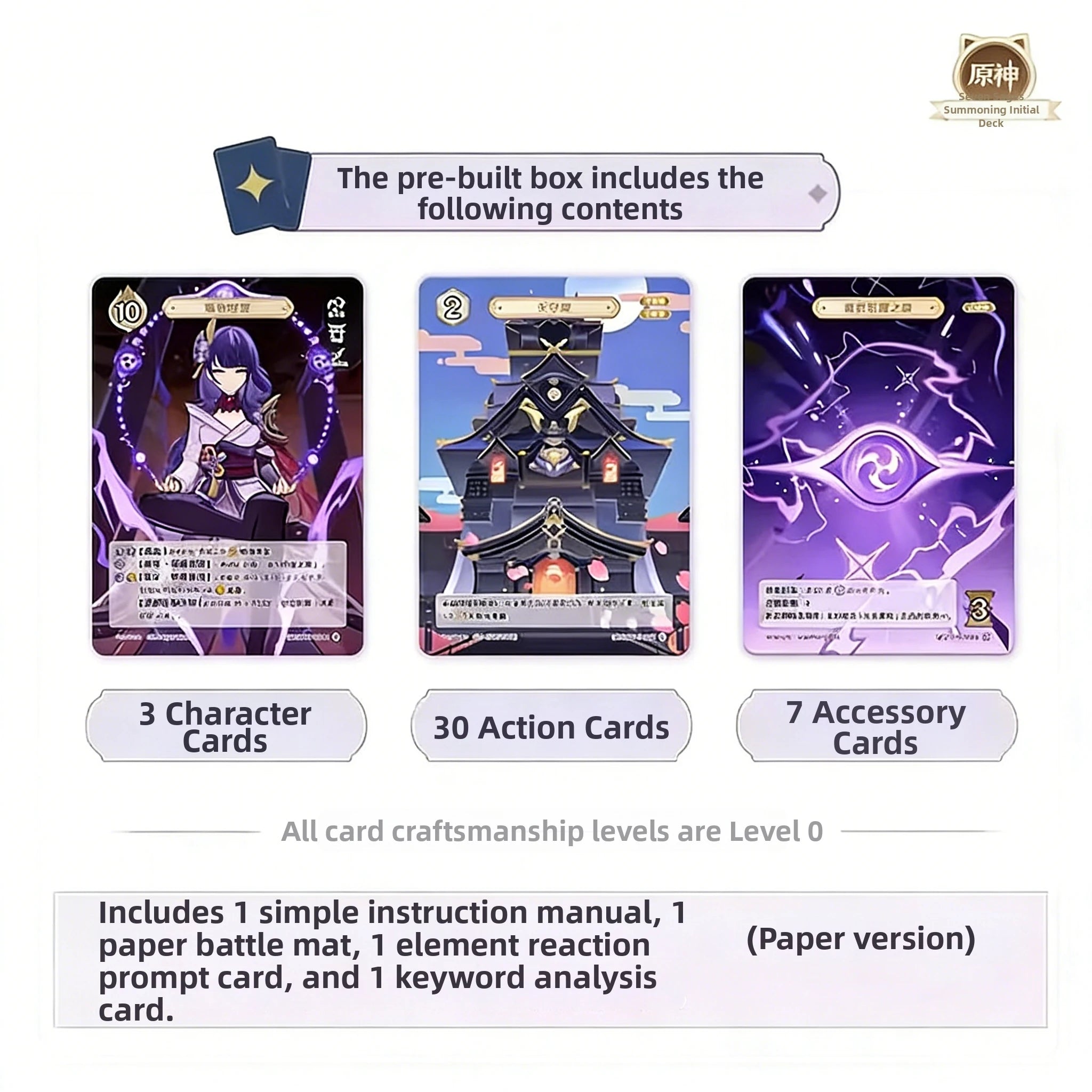 One box contains 3 Character Cards, 30 Action Cards, 7 Accessory Cards, 1 Simplified Instruction Manual, 1 Paper-based Battle Mat, 1 Elemental Reaction Reference Card, and 1 Keyword Explanation Card.