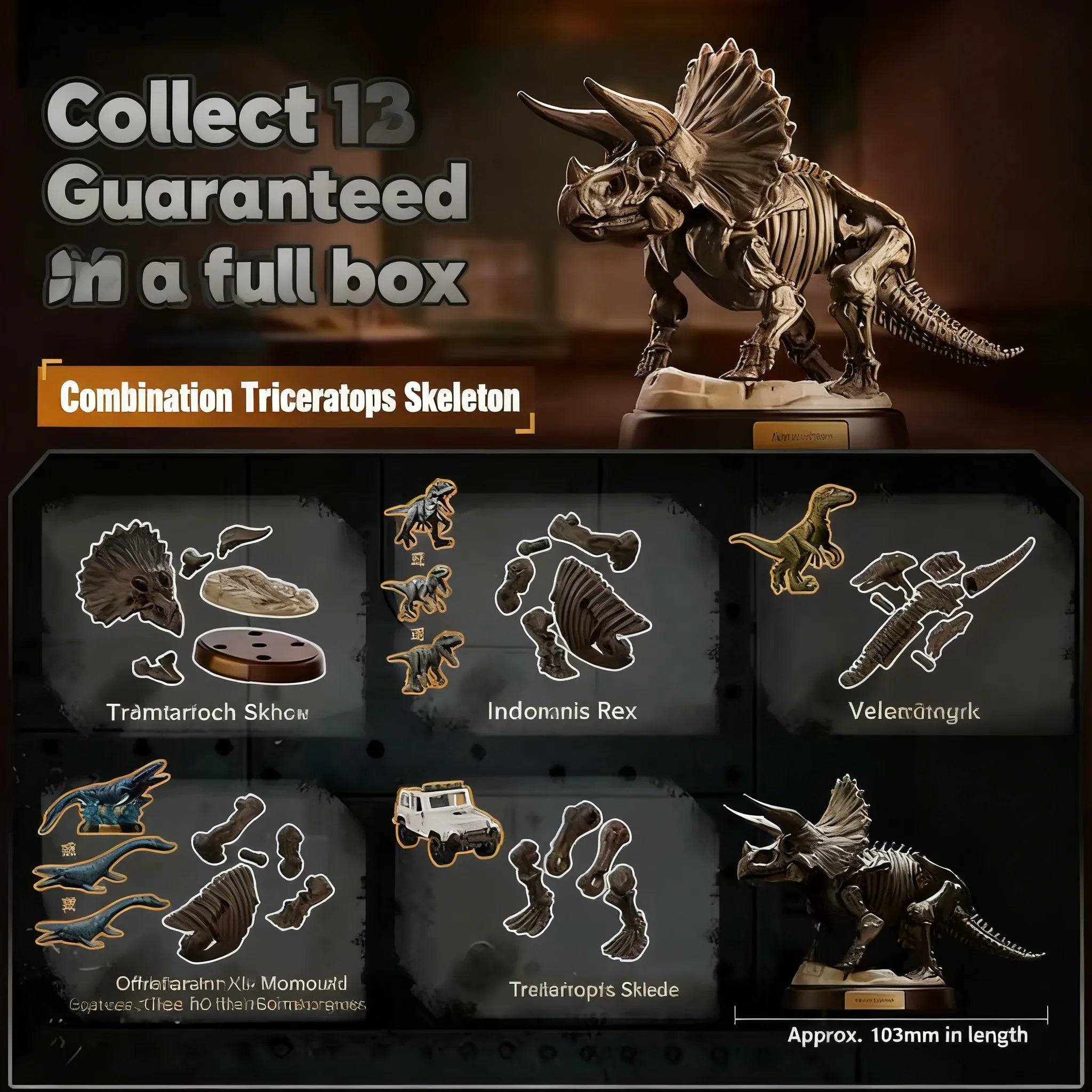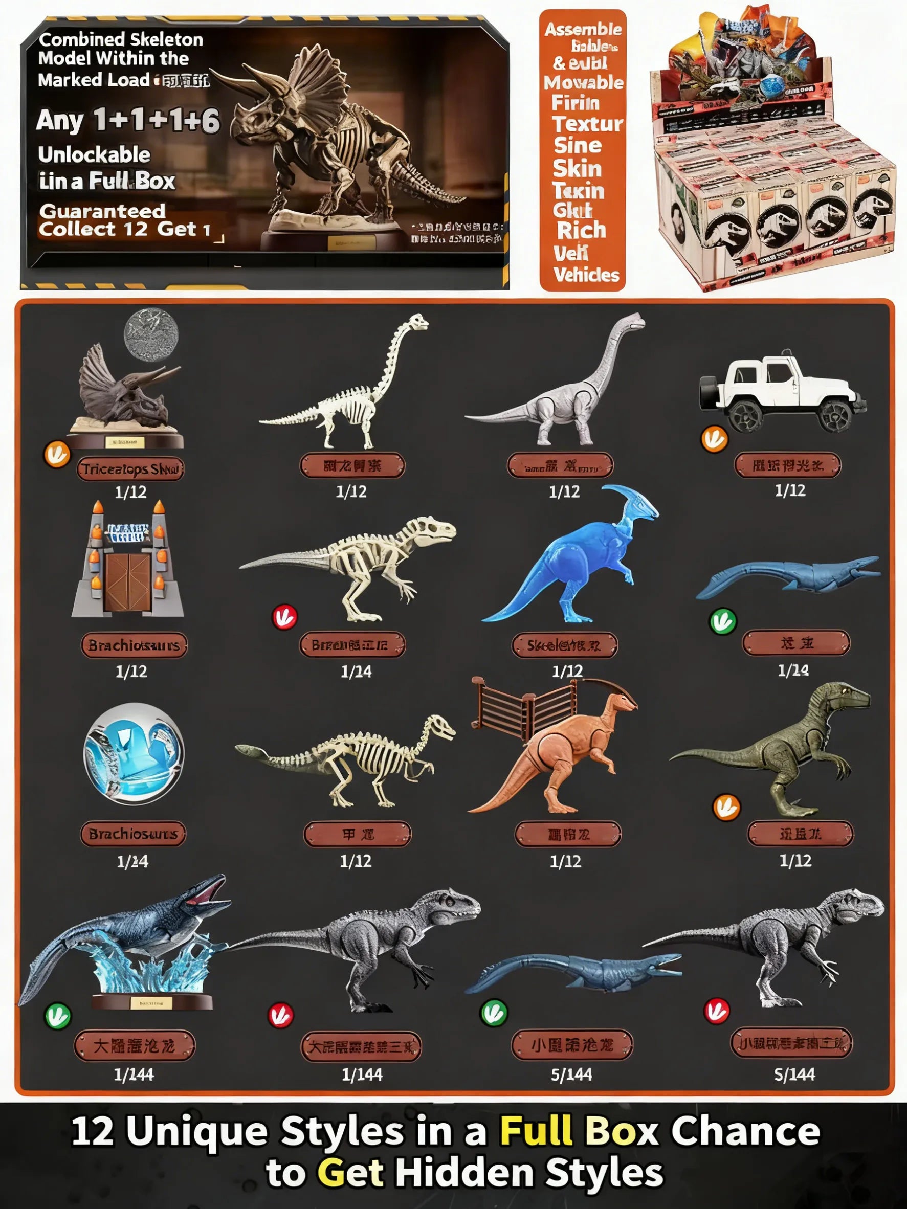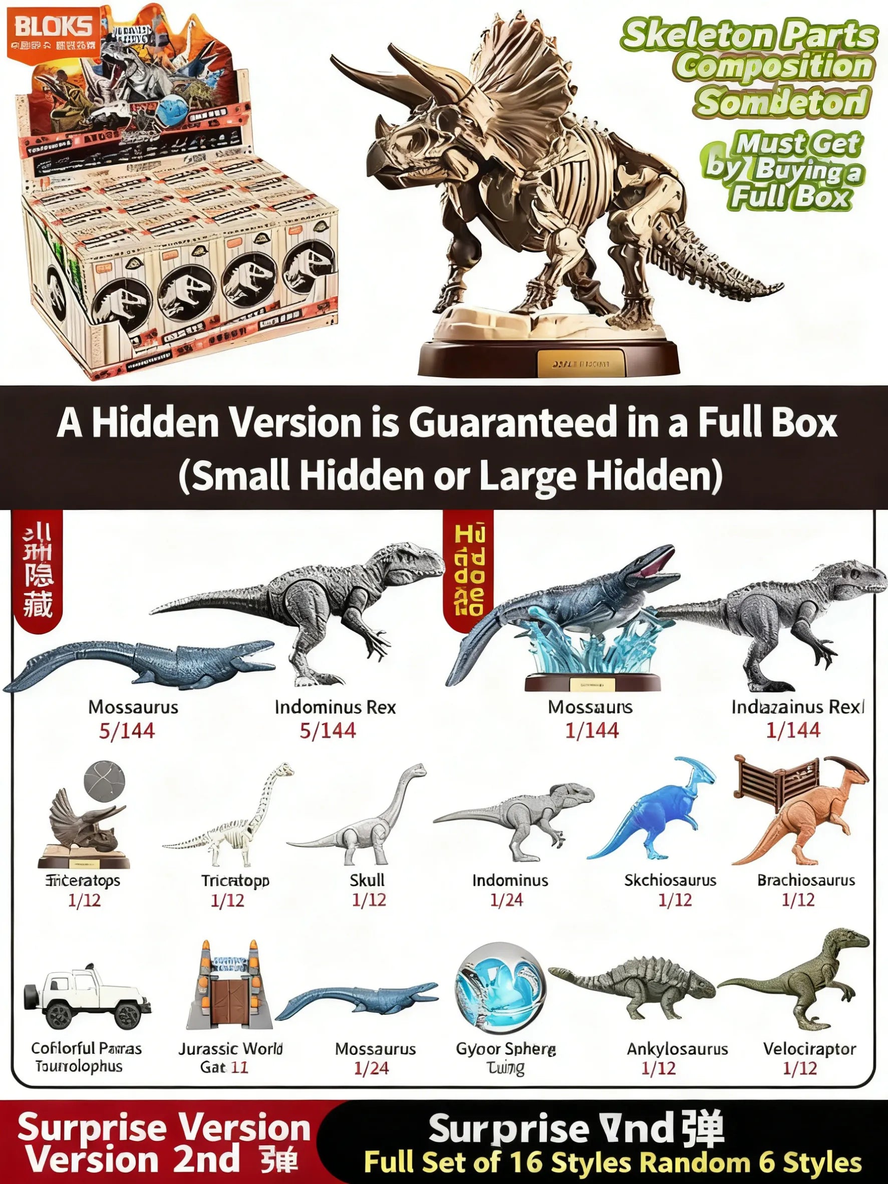 Product material: ABS plastic; product composition: Case PDQ: The series includes 12 unique styles; single box: 1 card (with instructions on the back) + 1 dinosaur building block pack + commemorative coin (only included with skull styles) + scattered skeleton parts (included with designated styles); blind box rules: For this series, the probability of a super secret rare is 1/144 (Mosasaurus, Indominus rex), the probability of a secret rare is 5/144 (Mosasaurus, Indominus rex); a case is guaranteed to include a secret rare (either super secret rare or secret rare), with secret rare styles replacing the corresponding regular styles; a case also guarantees a combined Triceratops skeleton.